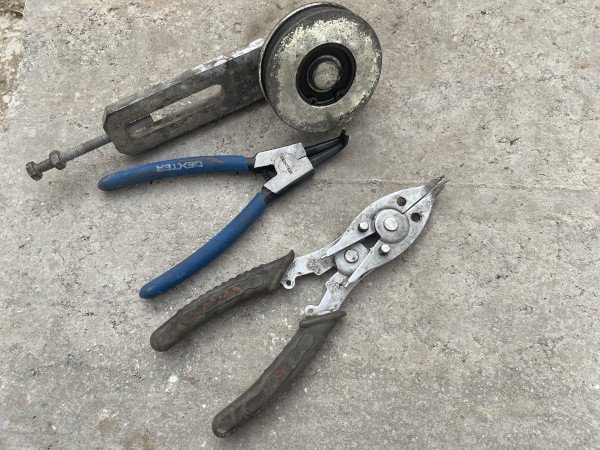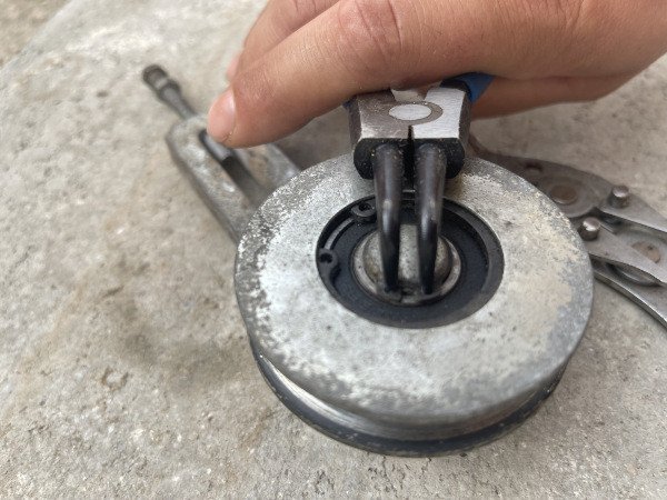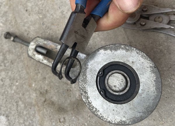 La poulie, son roulement, son support sont verrouillés ensemble par un assemblage à circlips intérieur et exterieur. Il faudra vous assurer d'avoir les outils pour démonter et remonter les circlips à disposition avant de commencer le travail.