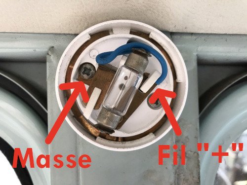 La masse est assurée par une des vis de fixation du plafonnier, qui entre en contact avec une languette du produit. L'alimentation se fait par le fil d'origine, qui vient se clipser entre la languette métallique et le clip plastique, voir les photos ci-après :