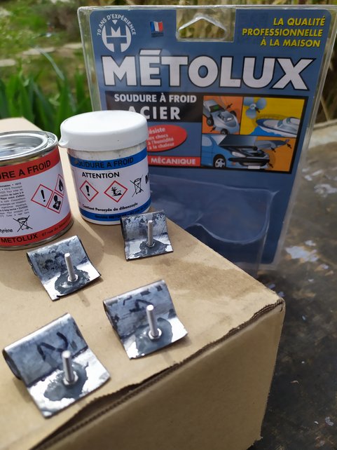 Afin de fixer les pièces sur la carrosserie, j'ai utilisé ce produit facile d'utilisation. Par contre il faut être rapide car il sèche vite. Un jeu de colle + durcisseur est suffisant pour les travaux.
