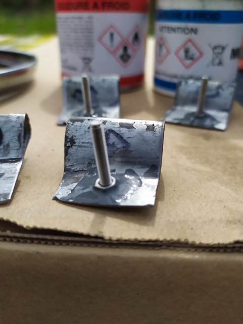Maintenant il faut bloquer l'écrou sur la tôle. Pour ce faire, sur la vis on insère un premier écrou (qui est caché sur la photo), on glisse la plaque puis le deuxième écrou que l'on serre. Ensuite on applique le Métolux sans toucher au filetage. Et on attend demain. Si ça ne tient pas, un petit coup de disqueuse et nettoyage puis on recommence. Quand on fixera l'enjoliveur définitivement, on serrera modérément.