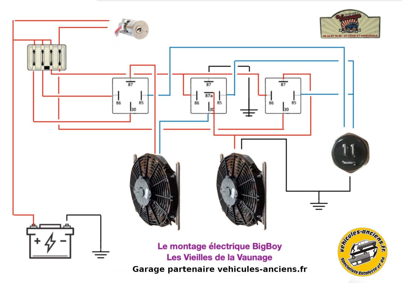 Voici un schéma de câblage proposé par notre garage partenaire Les Vieilles de la Vaunage, pour exploiter votre système à double ventilateurs sur le radiateur gros volume Big Boy.