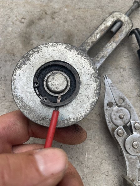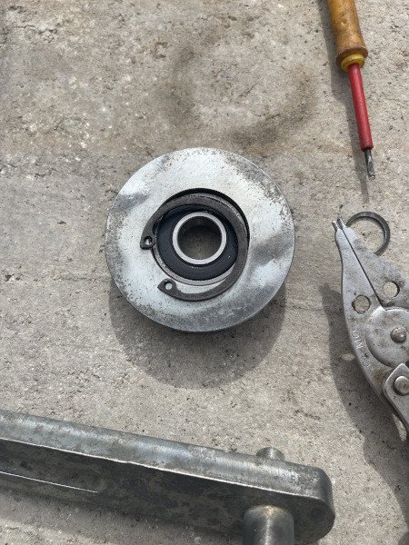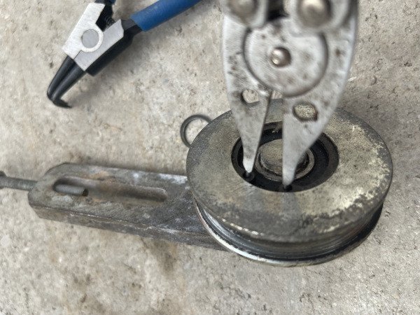 La poulie, son roulement, son support sont verrouillés ensemble par un assemblage à circlips intérieur et exterieur. Il faudra vous assurer d'avoir les outils pour démonter et remonter les circlips à disposition avant de commencer le travail.