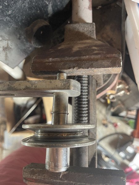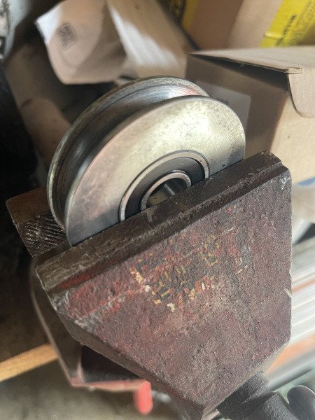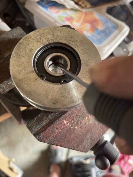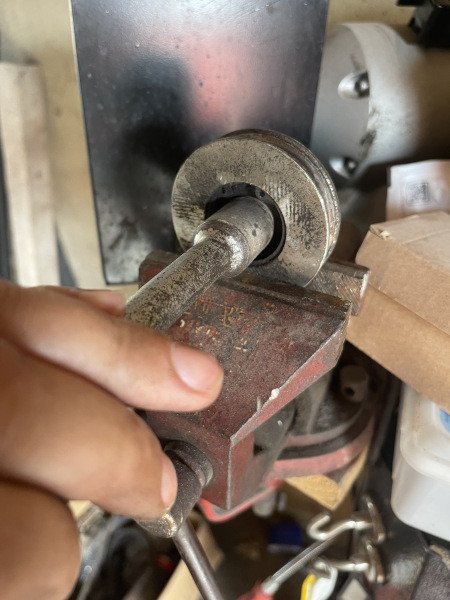 Verrouillez la poulie sur un étau, le circlip restant en place vers vous de façon à ce que le roulement sorte de l'autre côté et ne soit pas bloqué. Tapez sur le roulement, j'utilise ici une vieille rallonge de cliquet.