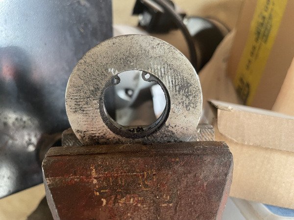Voici donc le montage sur l'étau. La douille va permettre lors du serrage de maintenir la bague intérieure du roulement, pendant que l'axe du support par l'action de l'étau va la traverser. La forme creuse de la douille permet de ne pas gêner le passage de l'axe lorsqu'il aura traversé le roulement.