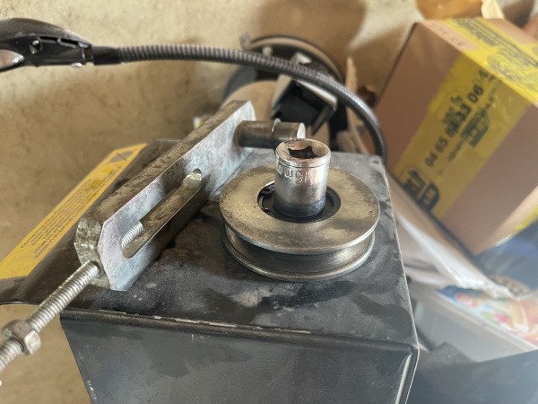 Pour retirer le support, bloquer la poulie sur un étau, et avec un jet et un marteau, tapez sur l'axe du support qui traverse le roulement en son centre.