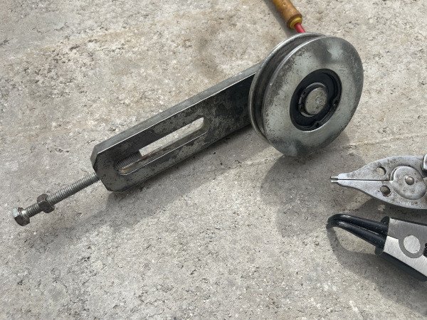 A NOTER : Ici, nous travaillons un galet tendeur équipé d'une poulie en acier usiné dans la masse. Ce montage à coexisté avec des poulies en tôle emboutie, qui sont plus fragiles. Lors de vos manips sur ces dernières, soyez particulièrement vigilant au vos assemblage avant de lancer le travail, de façon à ne pas détériorer/déformer la poulie.