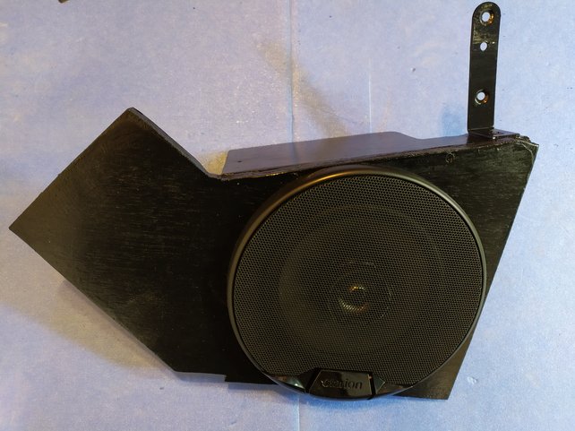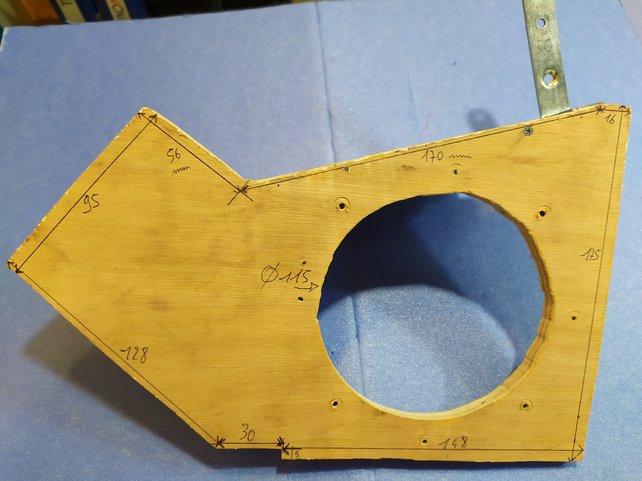 Vu la taille et le poids des haut parleurs, j'ai remplacé la plage arrière d'origine par une planche de 15 mm d'épaisseur. J'ai conservé les charnières d'origine ainsi que les fixations latérales. Et bien sur on peut retirer la planche.