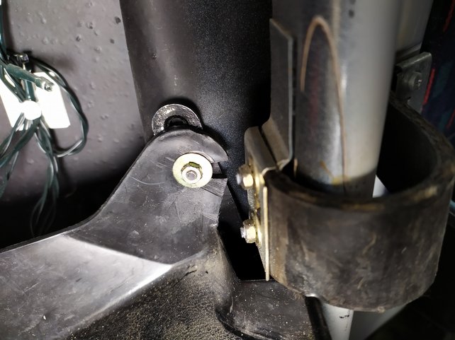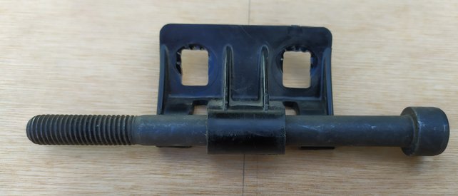 Fixation de l'équerre sur le boulon qui tient le vide poche. l'ensemble est ajusté pour rentrer légèrement en force. Il est calé par l'écrou du plancher. En fait je ne voulais pas percer ma voiture. Le tapis glisse sous la planche. La pompe à eau est cachée sous le tapis.