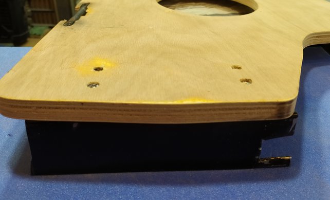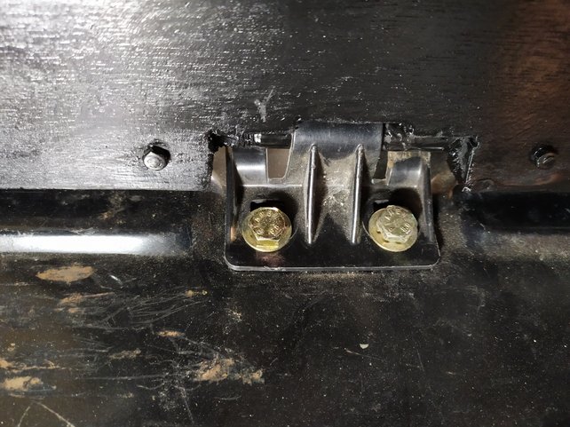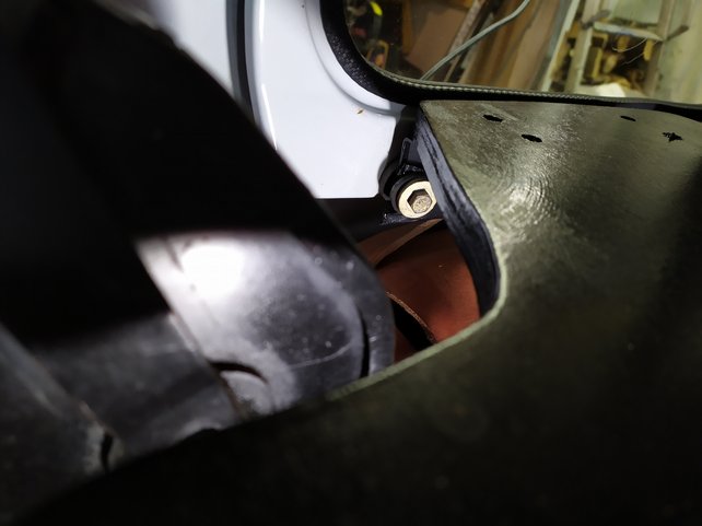Fixation de l'équerre sur l'écrou du vide poche. La planche est ajustée pour rentrer légèrement en force. Le tapis passe sous la planche.