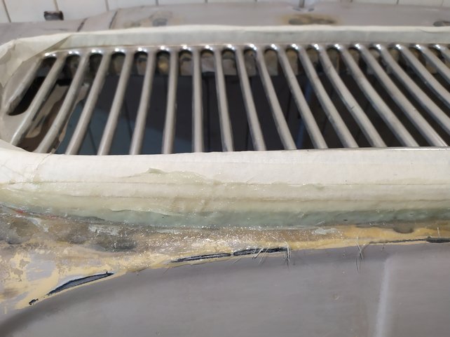 Pour que la calandre ne glisse pas lors de vibrations et n'endommage la peinture, un écrin sur mesure a été confectionné. Donc 2 couches de scotch de carrossier autour de la calandre puis mise en place de celle ci et badigeonnage de résine tout autour.
