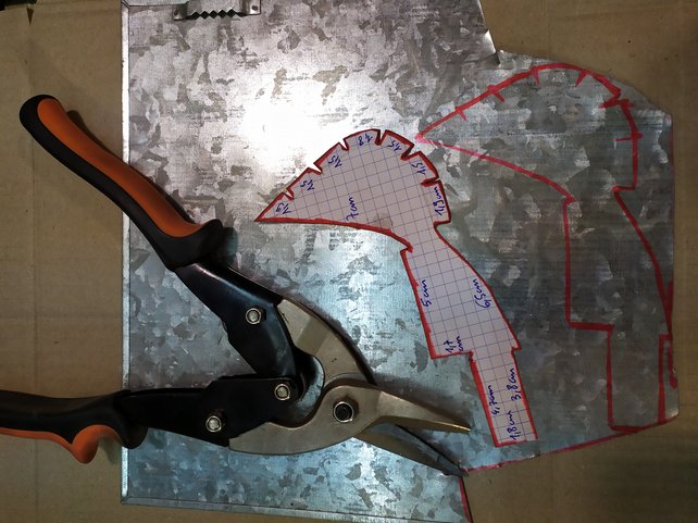 Le gabarit sur une tôle de galvanisé avec l'outil de coupe (ciseaux pour les rails métalliques des murs creux).