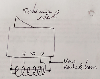 Pour une petite vitesse qui rend le ventilateur plus silencieux et efficace dans la diffusion d'air chaud, il faut faire chuter la tension de 30% environ, avec une résistance de 2,7 Ohms qui dissipera 30W. Attention dans mon cas la température mesurée sur le serpentin était d'environ 100°C. Le flux d'air des pales du ventilateur dissipe très bien la chaleur de la résistance.